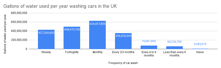 But car washes have an environmental impact. Anywhere between 10 and 25 gallons for each wash if you use a pressure washer. To put that in perspective, the average Brit uses 32 gallons of water per day. That got me thinking. How much water is used per year washing cars in the UK? I ran some very basic numbers, and plotted a distribution by frequency of washing the car (see below) and came to a number.