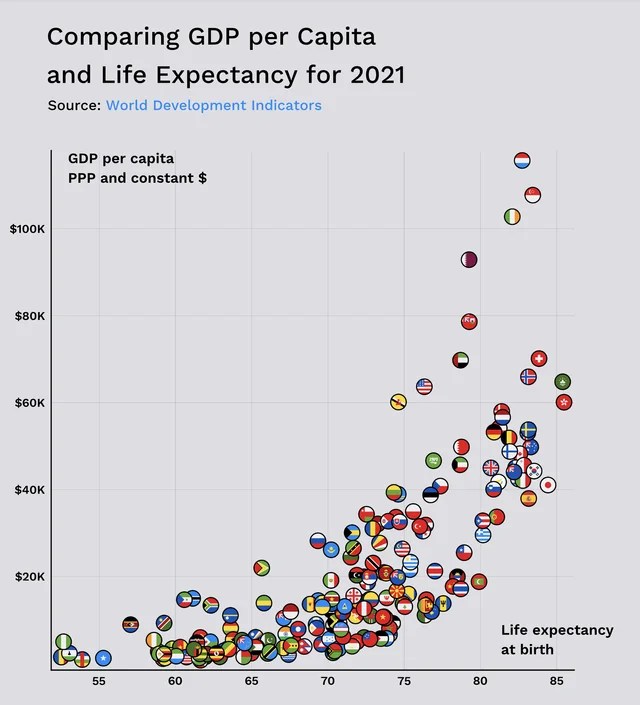 There is often an assumption made among transport planners that the richer the economy is (or gets), the more people travel. But the causes are often indirect. It is the same with increasing life expectancy at birth and increasing GDP per capita. While the data indicates a link, remember that correlation does not mean there is a direct causation.