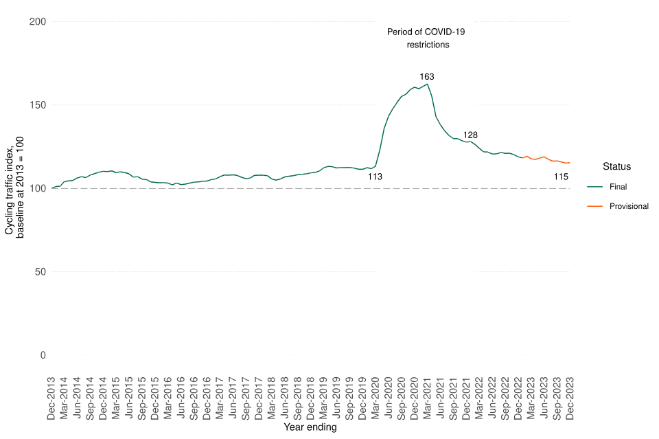 Cycling Traffic Levels in England by year (Source: Department for Transport)
