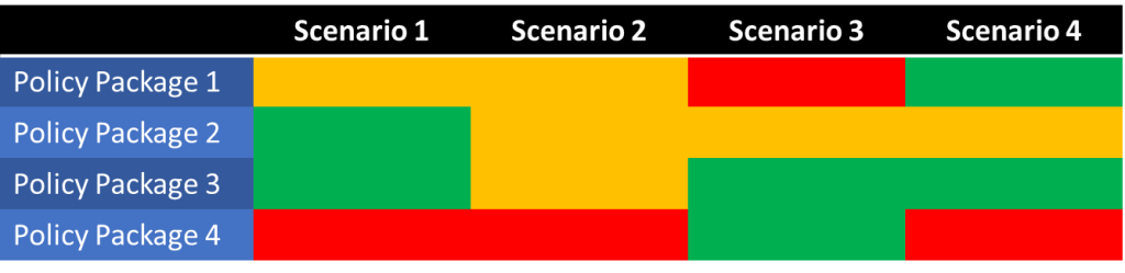 In this example, take Policy Package 1, which is showing an ability to miss earlier goals, but achieve the end one regardless of the two scenarios demonstrated. Meanwhile Policy Package 2 seems like a good bet in Scenario A, but in Scenario B its performance isn’t so sure.