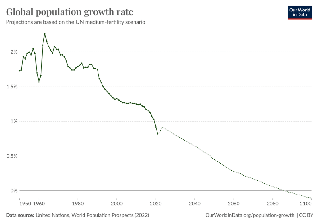 I have said this for a while now, but one of the more important trends us transport planners will have to consider is that in the future the population will largely cease to grow. And this graph shows just that. Population growth peaked in the 1960s.