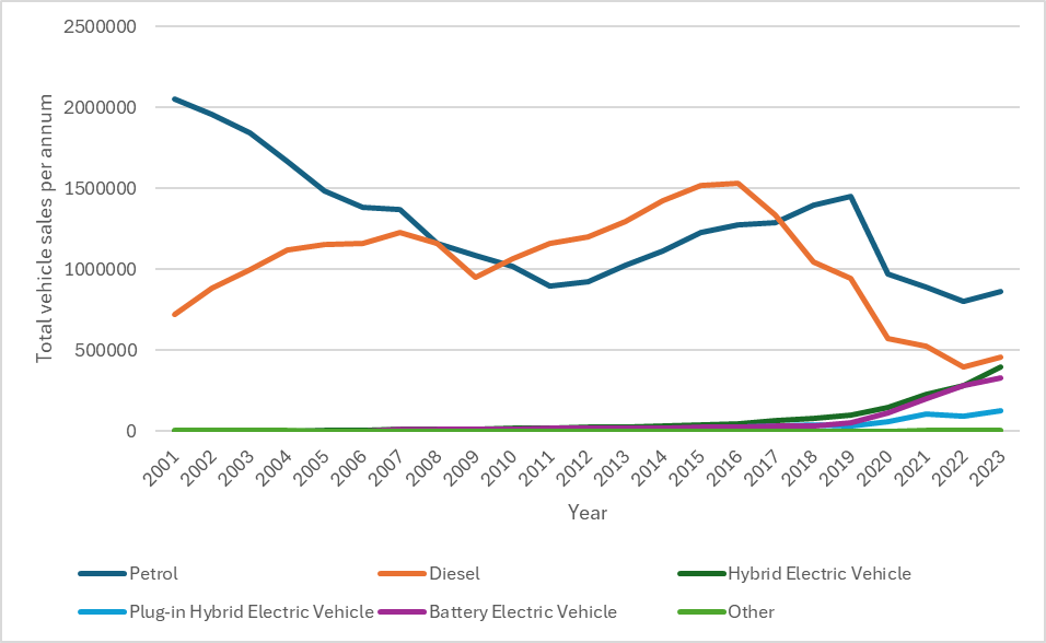 Total new vehicle registrations by fuel type (Source: Department for Transport)