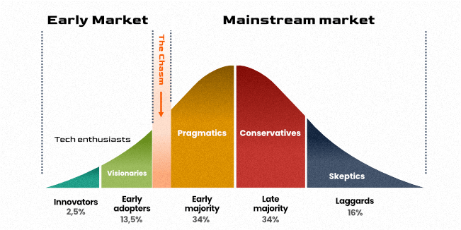The idea behind the chasm is simple. When a new technology is introduced, there are a lot of eager early adopters who value the solution for it being innovative. But the pragmatics want comfort and reliability, for your solution to almost blend into the background and be effortless in its use.