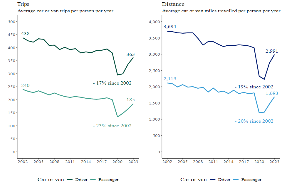 What this shows is something extremely stark. In terms of the number of trips, distance travelled, and hours travelled on average per person per year, we travel less than we did at the turn of the millennium. While the 2023 figures can partly be explained by a long-run COVID-19 impact, the trend before the pandemic hit on each of them was very, very clear. It was downward.