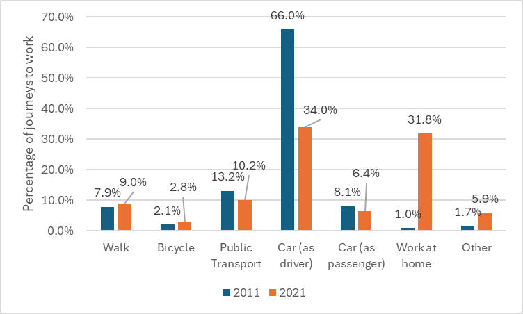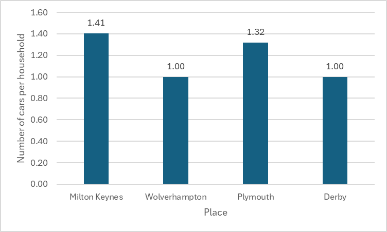 Number of cars per household of Milton Keynes and similarly-sized cities in the UK (Source: 2021 Census – note that official statistics on number of registered cars in local authority areas was not used as Milton Keynes is the registered address of many fleet car companies, thus skewing the data)